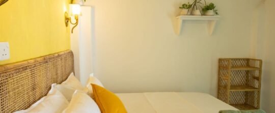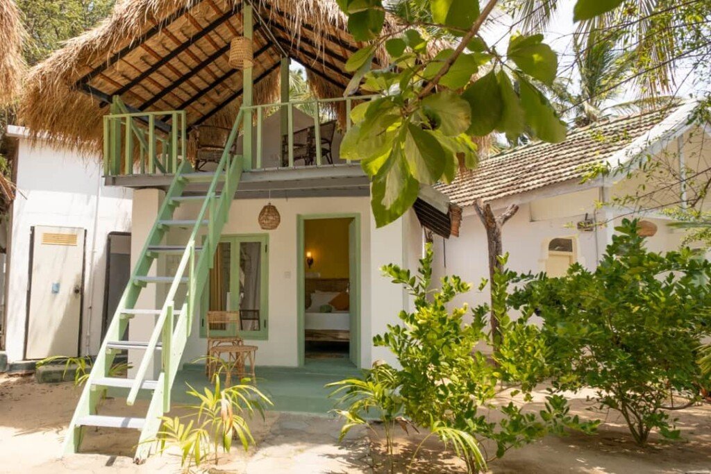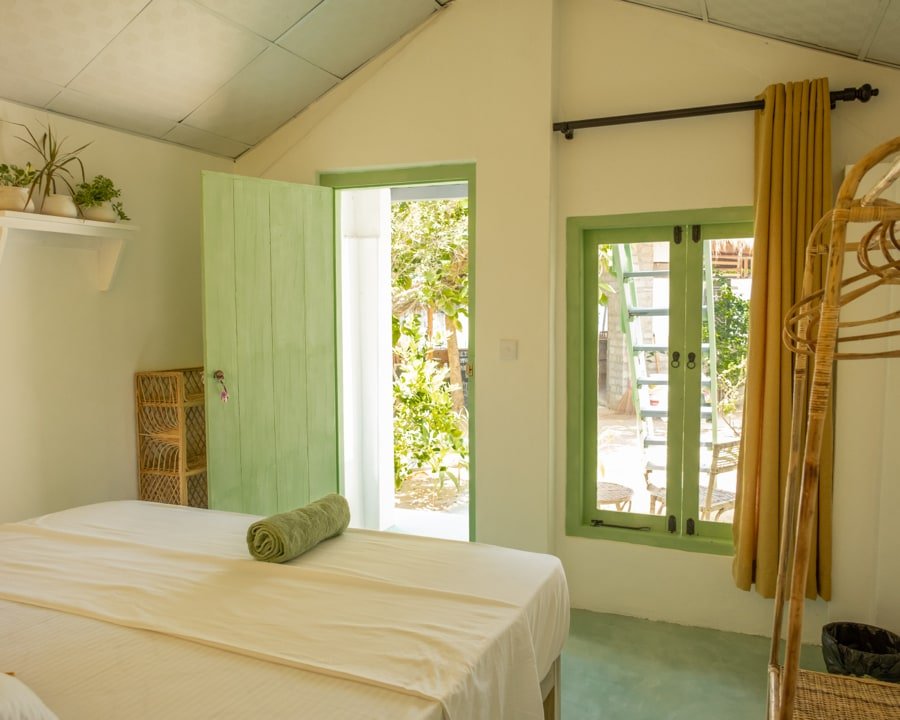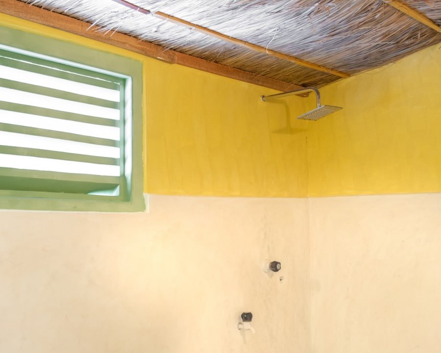 Our fan room is simple and clean with a fan, storage space for your belongings, and an attached bathroom. Towels are provided and the room will be cleaned every other day. Outside is a shaded seating area for you to relax and hang with friends after your surf sessions.